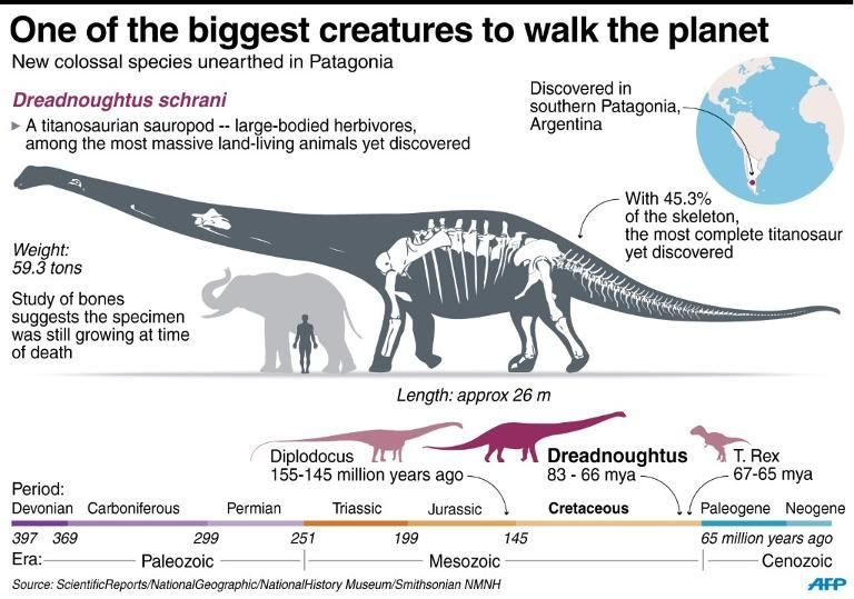 Os saurópodes são um grupo de dinossauros que evoluíram durante o Triássico, sobrevivendo até ao Cretácico, estando entre os animais de maior sucesso que já habitaram a Terra. Os dinossauros saurópodes são dos dinossauros mais intrigantes e famosos, caracterizados por um pescoço longo, cauda e corpo enormes. Entre eles podemos encontrar o Dreadnoughtus schrani, o maior animal terrestre que já existiu. Tinha um comprimento total de aproximadamente 26 metros e uma massa estimada em 59 toneladas. O Dreadnoughtus schrani é conhecido dos depósitos de rochas do sul da Patagónia, na Argentina, que datam de cerca de 77 milhões de anos atrás, durante o final do Período Cretácico (cerca de 100 a 66 milhões de anos atrás). É classificado como um titanossauro, um grupo que inclui os famosos Argentinossaurus, Saltasaurus e outros dinossauros gigantescos semelhantes.